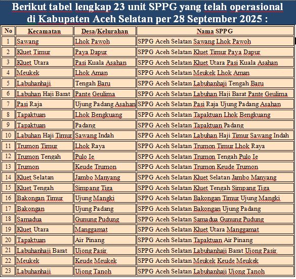 Tapaktuan | SaranNews – Program Makan Bergizi Gratis (MBG) melalui jaringan SPPG (Satuan Pelayanan Pemenuhan Gizi) terus berjalan di Kabupaten Aceh Selatan. Data Badan Gizi Nasional (BGN) mencatat, hingga 28 September 2025 terdapat 23 unit SPPG operasional yang tersebar di 18 kecamatan, mulai dari Kluet Timur hingga Labuhanhaji barat. Unit-unit tersebut meliputi antara lain SPPG Sawang Lhok Pawoh, Kluet Timur Paya Dapur, Kluet Utara Pasi Kuala Asahan, Meukek Lhok Aman, Tapaktuan Padang, hingga Labuhan Haji Ujong Tanoh .Kehadiran SPPG ini diharapkan memperluas akses layanan gizi bagi anak sekolah dan masyarakat rentan di berbagai pelosok.