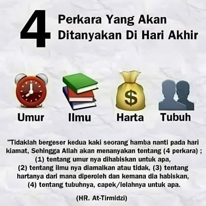 “Kedua kaki seorang hamba tidaklah beranjak dari tempat hisabnya pada hari kiamat hingga ia ditanya mengenai empat hal: (1) umurnya, untuk apakah ia habiskan, (2) jasadnya, untuk apakah ia gunakan, (3) ilmunya, apakah telah ia amalkan, (4) hartanya, dari mana ia peroleh dan dalam hal apa ia belanjakan” (HR Ibnu Hibban dan at-Tirmidzi).