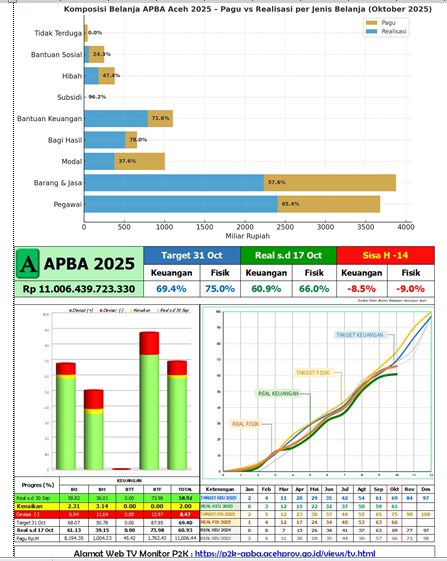 Banda Aceh | SaranNews – Laporan terkini Badan Pengelola Keuangan Aceh (BPKA) melalui dashboard P2K (Pemantauan Pengelolaan Keuangan) mengungkap bahwa realisasi APBA 2025 hingga 17 Oktober masih tertinggal dari target.