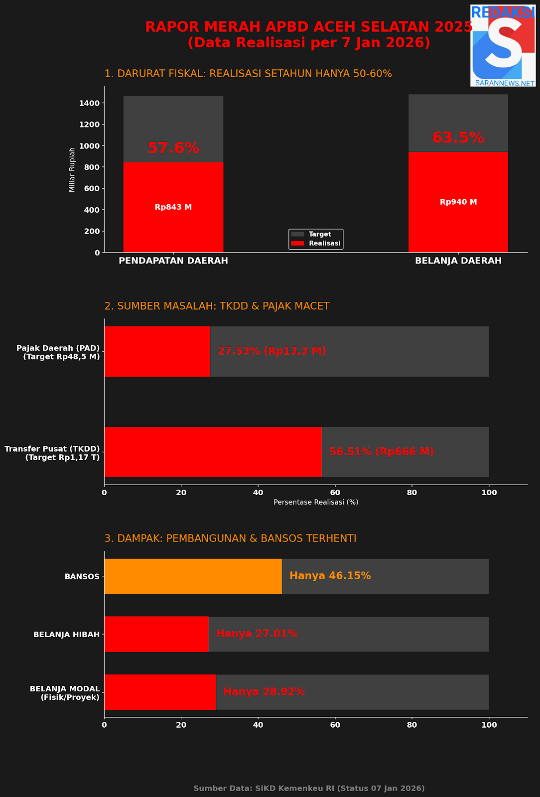 TAPAKTUAN | SaranNews – Pemerintah Kabupaten Aceh Selatan menutup Tahun Anggaran 2025 dengan catatan kinerja keuangan yang sangat mengkhawatirkan. Berdasarkan data Sistem Informasi Keuangan Daerah (SIKD) per tanggal 7 Januari 2026, daerah ini mengalami kontraksi fiskal hebat di mana realisasi pendapatan daerah secara agregat tidak menyentuh angka 60 persen dari target yang ditetapkan.