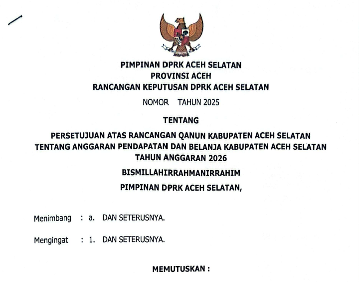 Berdasarkan salinan dokumen Rancangan Keputusan DPRK Aceh Selatan yang diterima redaksi Sarannews dari pihak Sekwan, terjawab sudah keraguan mengenai kepatuhan terhadap tenggat waktu perundang-undangan. Dokumen persetujuan atas Rancangan Qanun APBK 2026 tersebut tercatat secara administratif telah ditandatangani pada tanggal 30 November 2025. Dokumen krusial ini ditandatangani langsung oleh Ketua DPRK Aceh Selatan, Hj. Rema Mishul Azwa, SE.Ak di Tapaktuan.