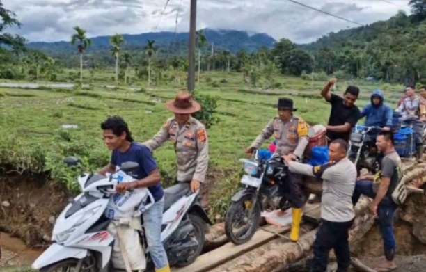 Sejumlah pihak kepolisian, ikut membantu perbaikan jembatan tersebut untuk membuat jembatan darurat agar warga bisa melintas dengan memasang batang kelapa diantara jembatan ambruk.