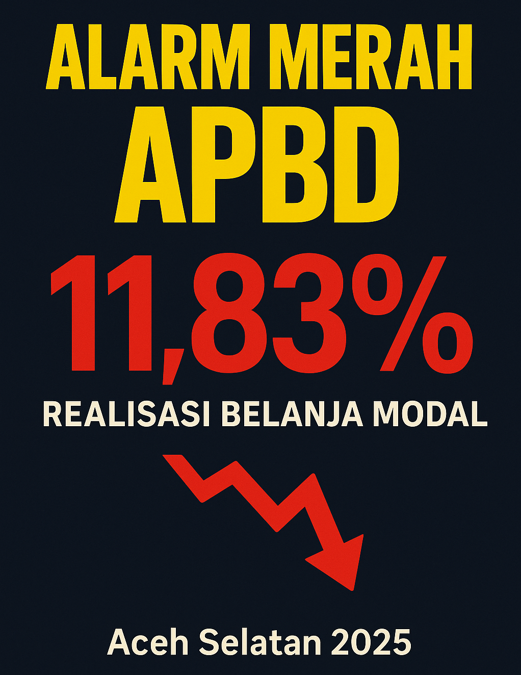 Tapaktuan | SaranNews – Tahun anggaran 2025 menyisakan waktu dua bulan, namun lonceng peringatan berbunyi nyaring dari laporan realisasi APBD Kabupaten Aceh Selatan. Data per 29 Oktober 2025 menunjukkan gambaran yang suram: roda pemerintahan dan pembangunan di daerah tersebut berjalan sangat lambat, nyaris mandek. Dengan realisasi belanja yang baru mencapai 56,58 persen dan pendapatan 56,31 persen, kita tidak sedang melihat keterlambatan biasa, melainkan potret kegagalan sistemik dalam mengeksekusi anggaran.