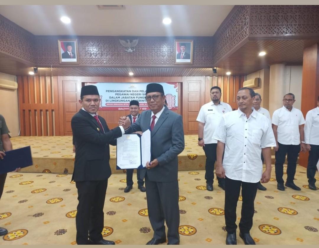 Banda Aceh|SaranNews – Wakil Gubernur Aceh, Fadhlullah, menyerahkan surat keputusan (SK) penunjukan Alhudri sebagai Pelaksana Tugas (Plt) Sekretaris Daerah Aceh menggantikan Muhammad Diwarsyah, di Gedung Serbaguna Kantor Gubernur Aceh, pada Rabu, 19 Februari 2025.