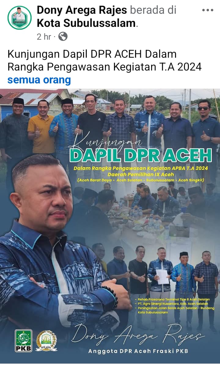 Informasi mengenai kunjungan pengawasan ini justru tidak datang dari rilis resmi Sekretariat DPR Aceh, melainkan dari unggahan pribadi salah seorang anggota dewan, Dony Arega Rajes. Melalui akun media sosialnya, politisi dari Fraksi Partai Kebangkitan Bangsa (PKB) ini mempublikasikan sejumlah foto kegiatannya bersama rekan-rekannya saat berada di Kota Subulussalam dan Kabupaten Aceh Barat Daya (Abdya). Dapil IX sendiri mencakup empat kabupaten/kota, yaitu Aceh Selatan, Aceh Barat Daya, Subulussalam, dan Aceh Singkil.