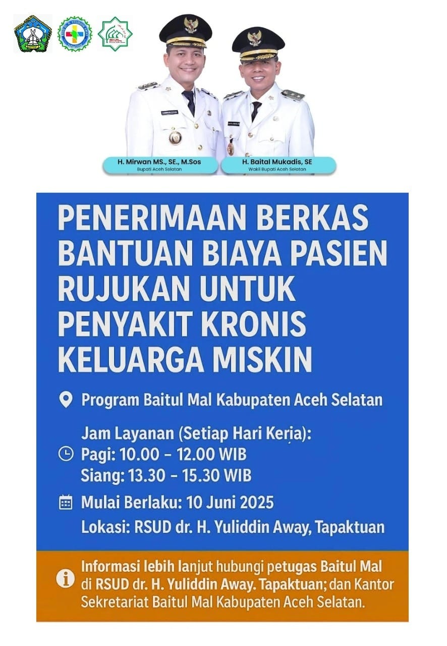 Tapaktuan || sarannews, 8 Juni 2025 – Sebagai tindak lanjut dari Launching Program Bantuan Biaya Pasien Rujukan Untuk Penyakit Kronis Keluarga Miskin oleh Bupati Aceh Selatan, H. Mirwan MS, SE, M.Sos pada tanggal 27 Mei 2025 di RSUD dr. H. Yuliddin Away (RSUYA) Tapaktuan, Baitul Mal Kabupaten Aceh Selatan bersama Manajemen RSUYA bersepakat membuka layanan tambahan khusus program bantuan biaya pasien rujukan langsung layanan oleh Petugas Baitul Mal Kabupaten Aceh Selatan di RSUYA Tapaktuan. Langkah ini diambil untuk mempermudah akses masyarakat miskin yang sedang menjalani proses rujukan medis akibat penyakit kronis, bukan saja ke Sekretariat Baitul Mal Kabupaten Aceh Selatan juga bisa langsung ke Loket Layanan di RSUYA Tapaktuan.