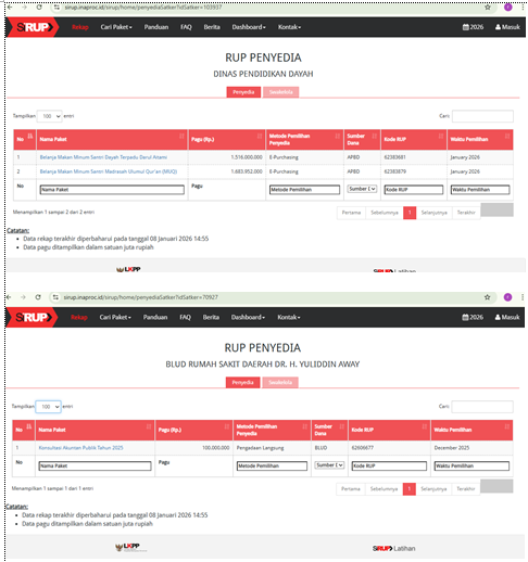 TAPAKTUAN | SaranNews – Mengawali Tahun Anggaran 2026, Pemerintah Kabupaten Aceh Selatan mulai menayangkan Rencana Umum Pengadaan (RUP) melalui Sistem Informasi Rencana Umum Pengadaan (SiRUP) LKPP. Berdasarkan pantauan Redaksi pada Jumat (9/1/2026), sejumlah angka fantastis mulai terlihat pada pos belanja rutin di beberapa Satuan Kerja Perangkat Kabupaten (SKPK).
