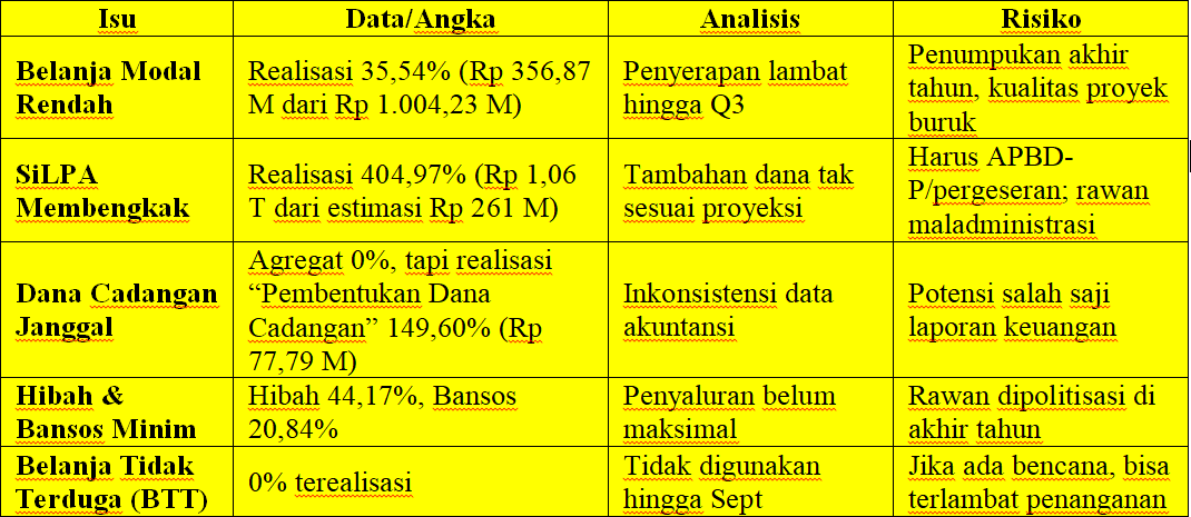 Anomali lain terlihat pada pengeluaran pembiayaan daerah. Data agregat menunjukkan 0 persen, namun rincian “Pembentukan Dana Cadangan” justru terealisasi sebesar 149,60 persen atau Rp 77,79 miliar. Inkonsistensi ini dinilai berbahaya karena menimbulkan potensi salah saji dalam laporan keuangan pemerintah daerah.