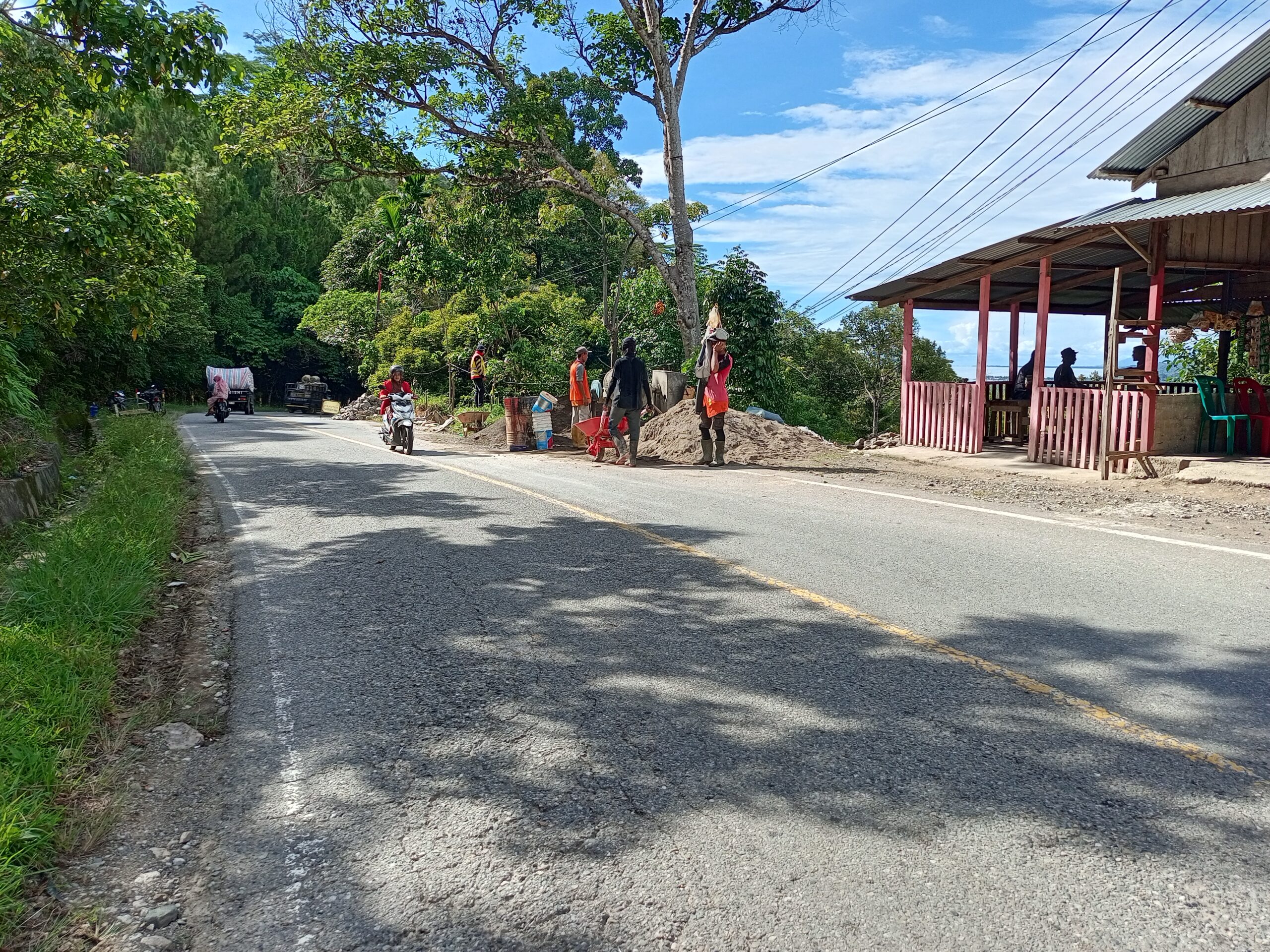 Pantauan langsung Sarannews di lokasi pada Minggu (08/12/2025), aktivitas perbaikan sudah berjalan. Sejumlah pekerja terlihat sibuk mengerjakan dinding penahan tanah (talud) di sisi tebing yang tergerus. Material bangunan seperti batu, pasir, dan satu unit mesin pengaduk semen (molen) tampak disiagakan dan beroperasi di bahu jalan. Para pekerja berjibaku memperkuat struktur jalan guna mencegah kerusakan meluas, mengingat curah hujan di wilayah ini masih cukup tinggi.