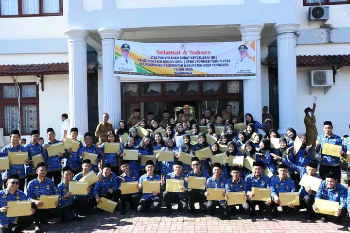 SaranNews||ACEH TENGGARA– Bupati Aceh Tenggara HM Salim Fakhry SE MM serahkan SK CPNS sebanyak 58 orang, SK tersebut terdiri dari 45 orang tenaga teknis dan 13 orang tenaga kesehatan tahun 2024, Senin 26 Mei 2025.