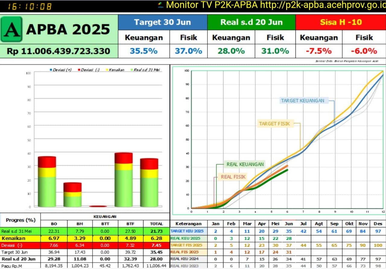 Banda Aceh-SaranNews | Memasuki semester kedua tahun anggaran 2025, daya serap Anggaran Pendapatan dan Belanja Aceh (APBA) dinilai masih sangat rendah. Berdasarkan pemantauan Transparansi Tender Indonesia (TTI) melalui aplikasi Monitor P2K Pemerintah Aceh yang disiarkan secara real time, tercatat daya serap keuangan baru mencapai 28 persen, sedangkan serapan fisik sekitar 31 persen.