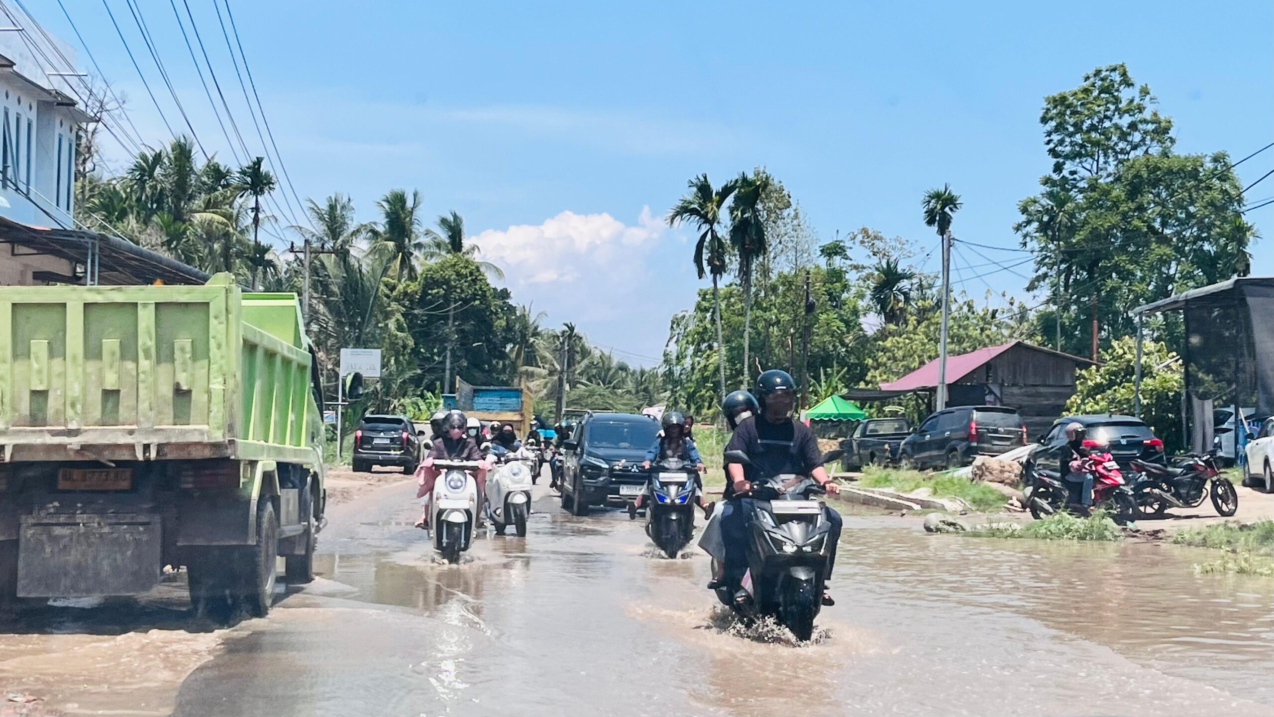 Seorang pengendara, Zikri, mengatakan air mulai menggenangi jalan sejak pagi. “Saya lihat air sudah tergenang dari pagi, jadi memang harus pelan-pelan lewat, apalagi kalau ada mobil dan truk besar,” ujarnya.
