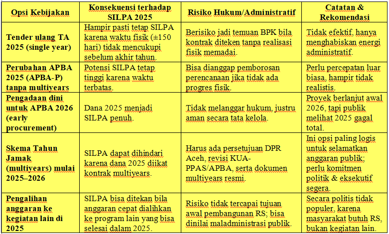 - Pengalihan ke kegiatan lain: bisa tekan SILPA, tapi tujuan utama pembangunan RS batal tercapai.