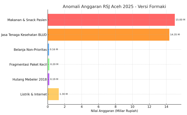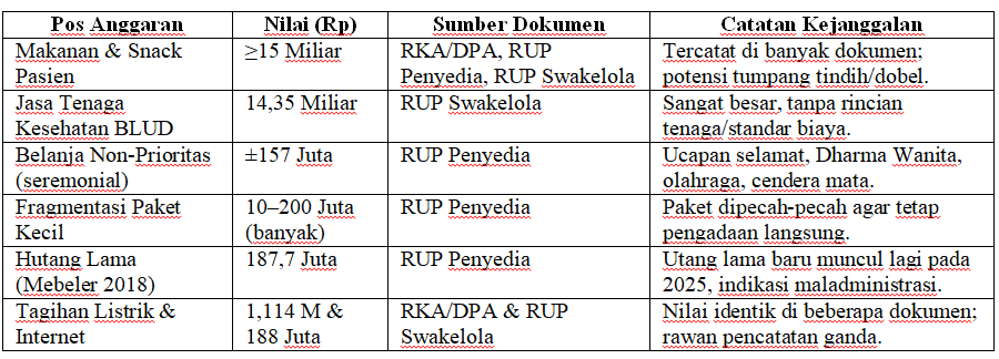 Dalam rilisnya, Formaki menyebutkan bahwa belanja makanan pasien menjadi sorotan utama. Anggaran tercatat di berbagai dokumen resmi ; RKA, DPA, RUP Penyedia, hingga RUP Swakelola, dengan nilai kumulatif lebih dari Rp15 miliar. “Ini berpotensi terjadi tumpang tindih, bahkan duplikasi anggaran yang merugikan keuangan negara,” tegas Formaki.