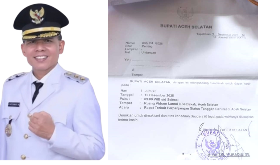 Agenda: Perpanjangan Status Darurat Rapat tersebut dijadwalkan berlangsung hari ini, Jumat (12/12/2025) pukul 09.00 WIB bertempat di Ruang Vidcon Lantai II Setdakab Aceh Selatan.