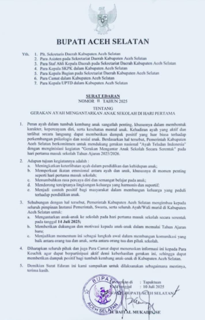 Banda Aceh | sarannews – Pemerintah Kabupaten Aceh Selatan baru saja mengeluarkan Surat Edaran Nomor 11 Tahun 2025 tentang Gerakan Ayah Mengantarkan Anak Sekolah di Hari Pertama. Dalam SE tersebut, Bupati mengimbau agar seluruh ayah di Aceh Selatan mengantar anak-anak mereka secara serentak pada 14 Juli 2025, yakni hari pertama masuk sekolah Tahun Ajaran 2025/2026.
