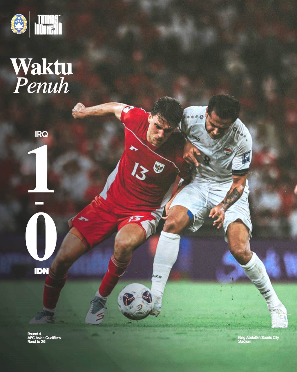 Hasil ini mengunci posisi Indonesia sebagai juru kunci klasemen akhir Grup B tanpa meraih satu poin pun dari dua laga. Bagi Irak, kemenangan ini membuka kembali jalan mereka untuk menghadapi Arab Saudi di laga penentuan. Meskipun mimpi tampil di Piala Dunia edisi ini telah berakhir, kekalahan ini menjadi bahan evaluasi mendalam bagi seluruh elemen tim, mulai dari strategi, komposisi pemain, hingga mentalitas bertanding. Perjalanan sepak bola Indonesia harus terus berlanjut dengan introspeksi untuk menyongsong turnamen-turnamen penting berikutnya dengan persiapan yang jauh lebih matang.[Kb]