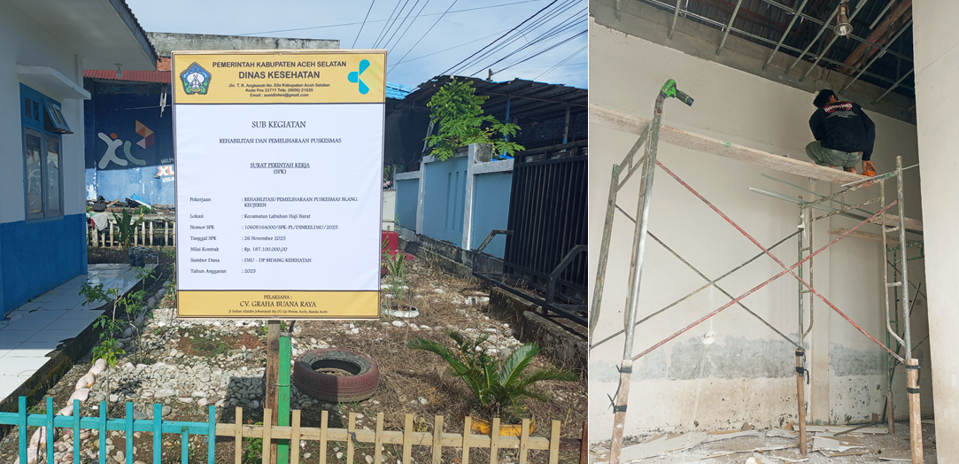 TAPAKTUAN | SaranNews – Menjelang berakhirnya tahun anggaran 2025, sorotan tajam tertuju pada pelaksanaan proyek fisik di lingkungan Dinas Kesehatan Kabupaten Aceh Selatan. Salah satunya adalah paket pekerjaan Rehabilitasi/Pemeliharaan Puskesmas Blang Keujeren, Kecamatan Labuhan Haji Barat, yang dinilai kritis dan terancam gagal selesai tepat waktu (wanprestasi).