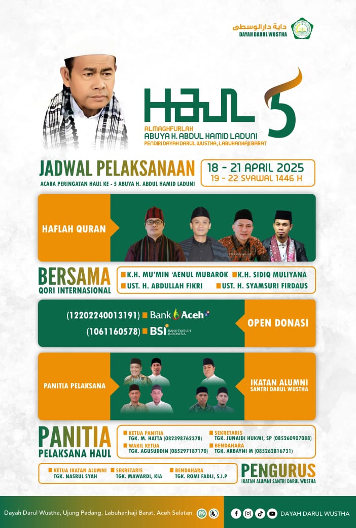 SaranNews.Net – Ponpes/Dayah Darul Wustha Ujung Padang, Labuhanhaji Barat, Aceh Selatan akan menggelar kanduri Haul ke 5, Almarhum Abuya Syeikh H.Abdul Hamid Laduni. Dalam Haul ini akan menghadirkan Qori terbaik Internasional.
