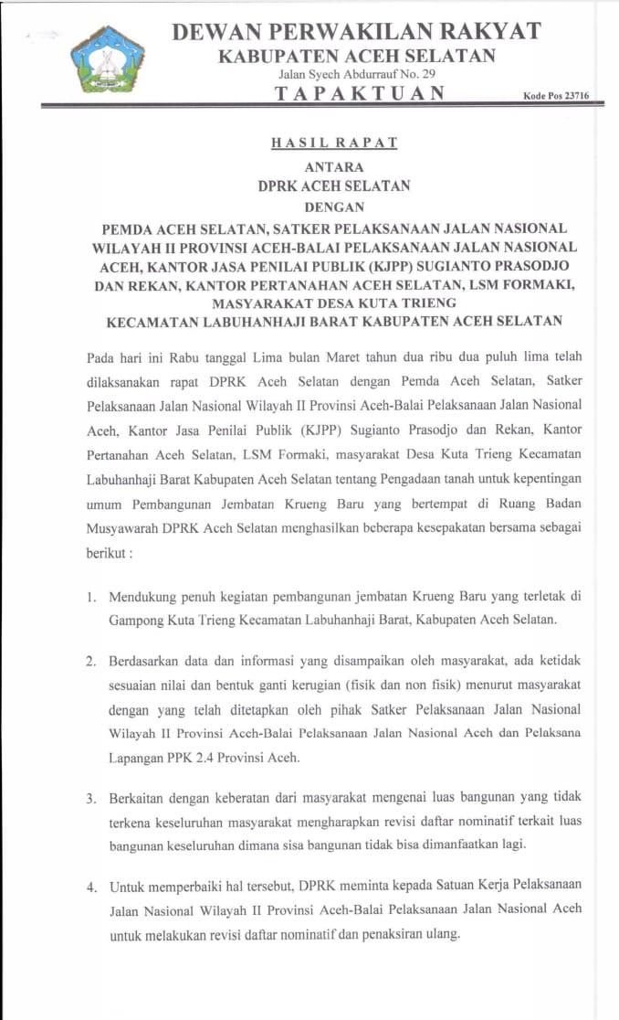 Sehingga, semua pihak dan unsur terkait yang hadir dalam rapat yang difasilitasi DPRK tersebut bersepakat untuk dilakukan peninjauan ulang atas nilai dan bentuk ganti kerugian masyarakat yang terdampak.