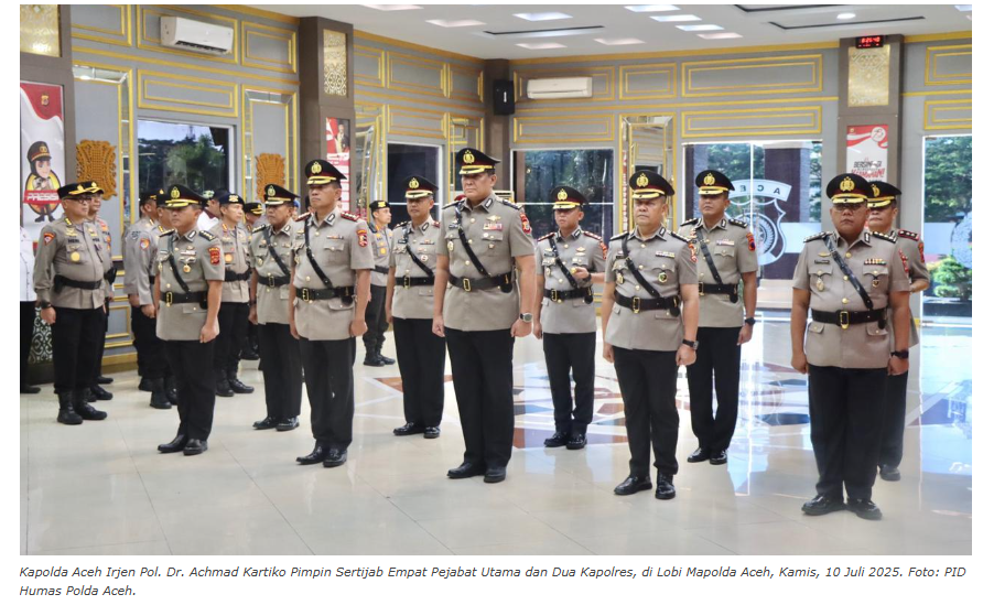 Banda Aceh | sarannesw – Kapolda Aceh Irjen Pol. Dr. Achmad Kartiko memimpin upacara serah terima jabatan (sertijab) empat pejabat utama dan dua kapolres jajaran Polda Aceh. Kegiatan tersebut berlangsung di Lobi Mapolda Aceh, Kamis, 10 Juli 2025.