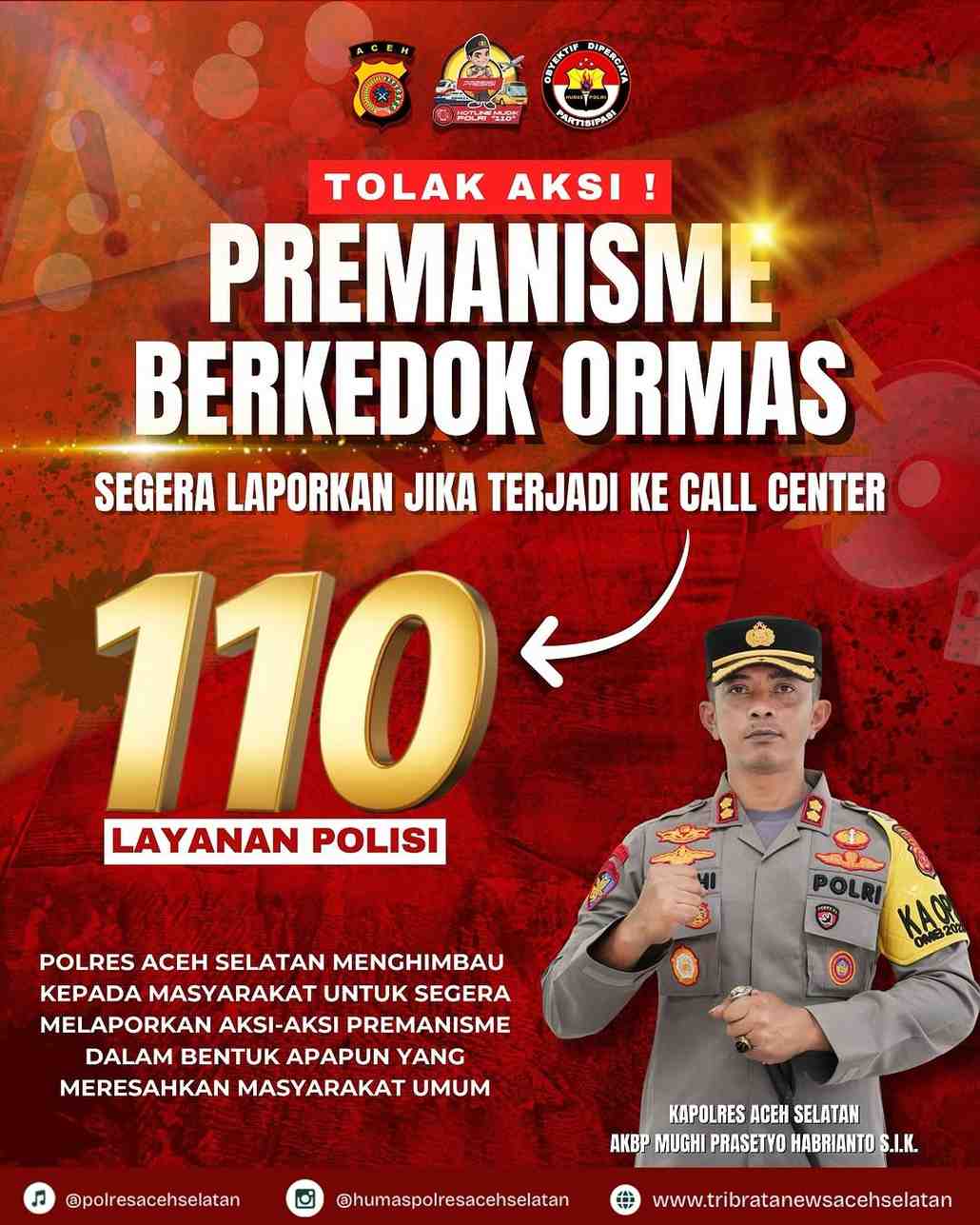 SaranNews.Net – Kapolres Aceh Selatan AKBP Mughi Prasetyo Habrianto,S.I.K menegaskan bahwa pihaknya menolak segala bentuk premanisme, terutama yang berkedok organisasi masyarakat (ormas). Ia memastikan akan menindak tegas setiap aksi pemerasan dan pungutan liar yang merugikan masyarakat.