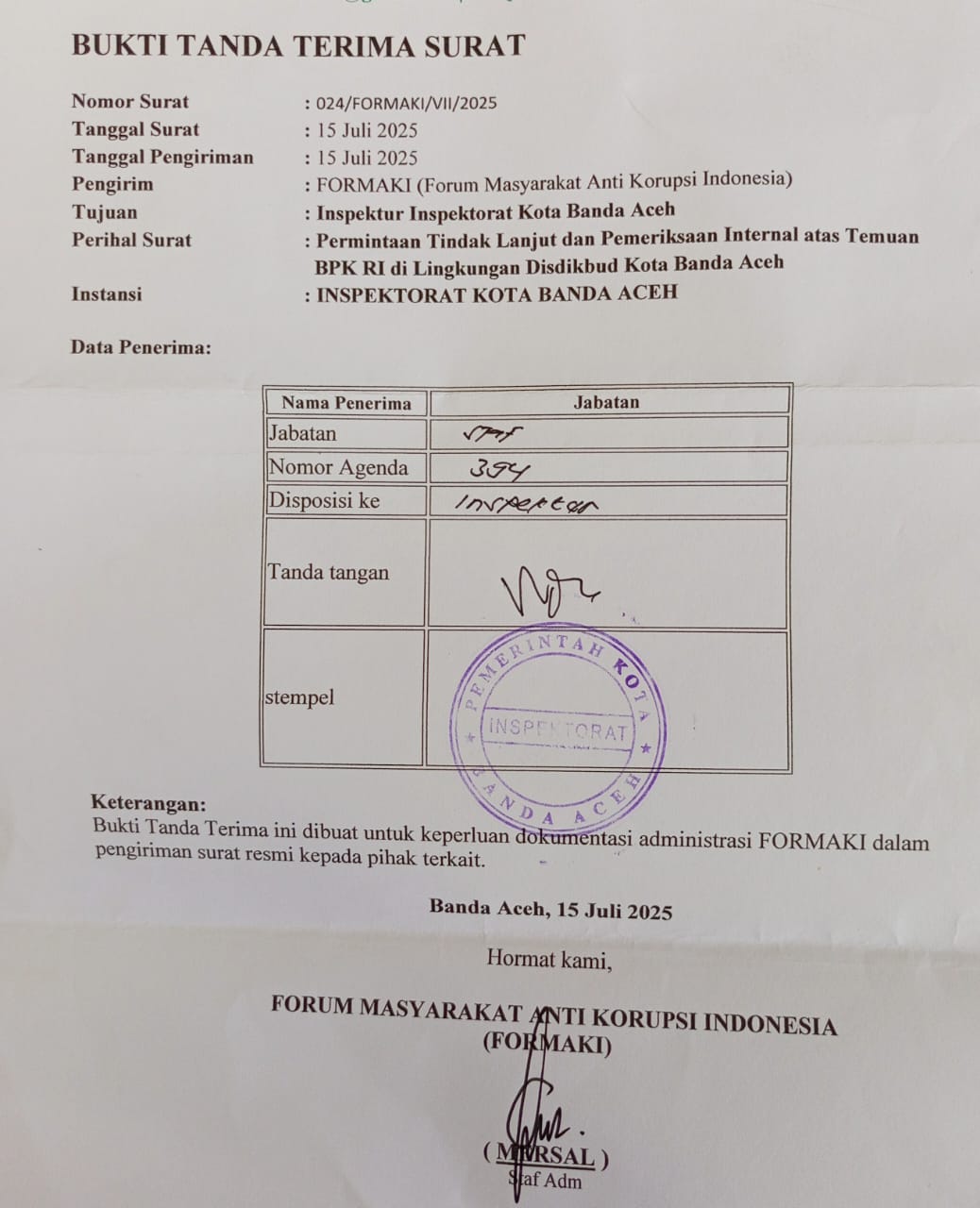 Berdasarkan siaran pers resmi yang diterima redaksi sarannews.net, surat desakan tersebut bernomor 024/FORMAKI/VII/2025 dan telah diterima oleh Bagian Umum Inspektorat Kota Banda Aceh dengan nomor agenda penerimaan 394.