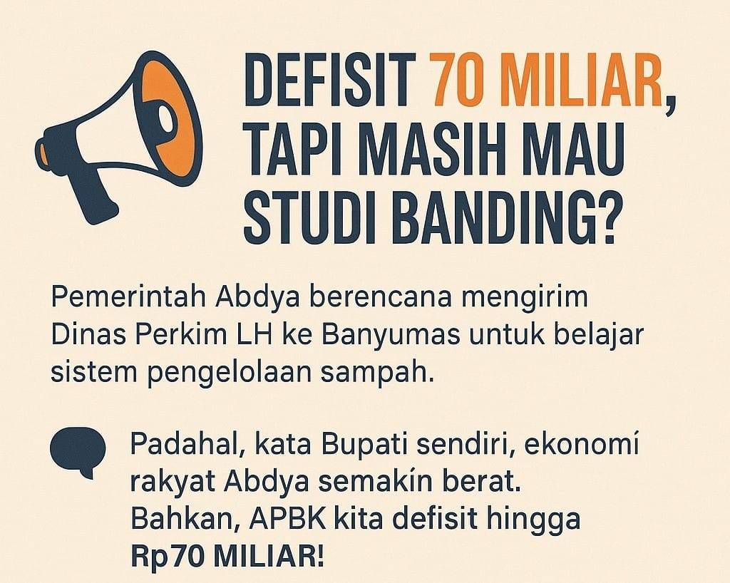 Rencana Pemkab Abdya mengirimkan pejabat dan staf dinas dalam rangka studi banding pengelolaan sampah, ini dinilai akan mengabaikan Instruksi Presiden (Inpres) Nomor 1 tahun 2025, dimana presiden menginstruksikan kepada seluruh kepala daerah agar melakukan efisiensi anggaran tahun 2025.