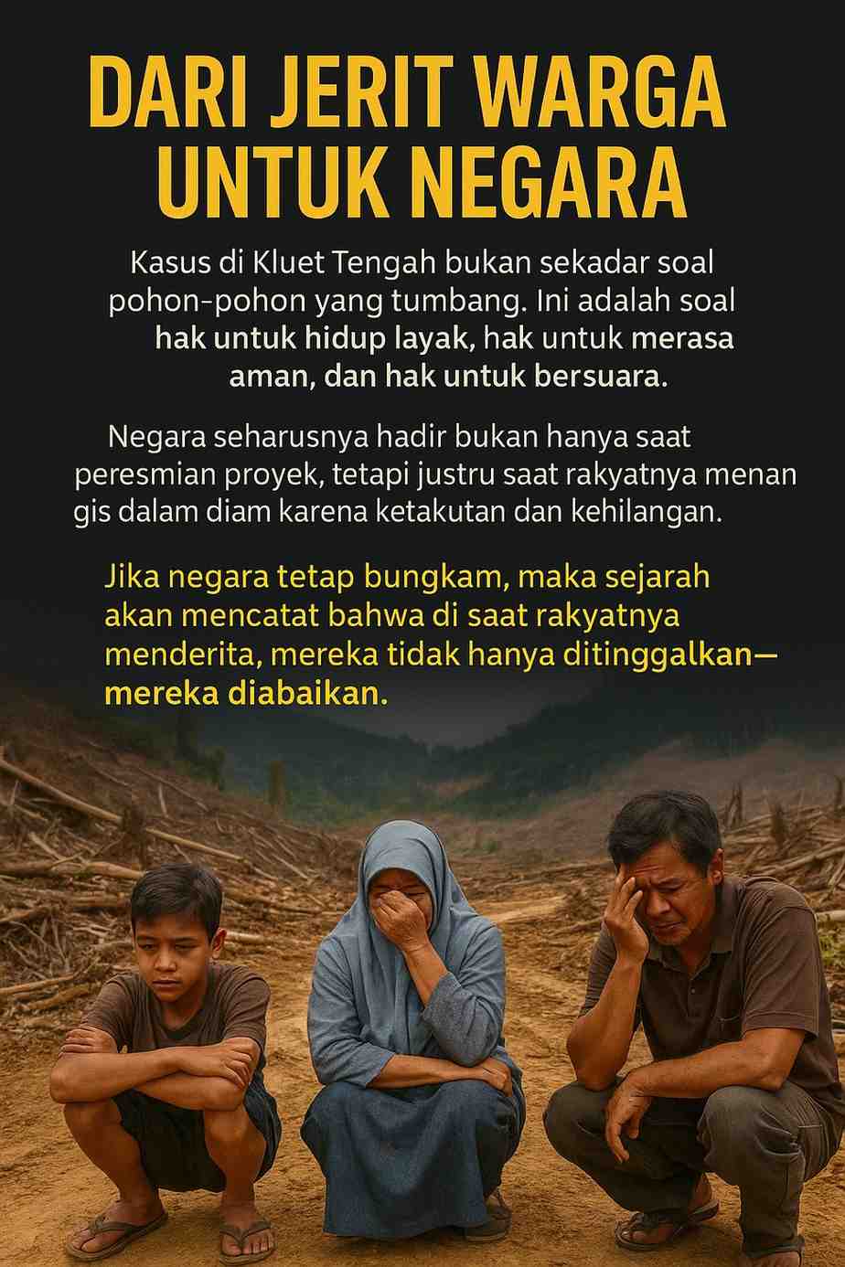 Hutan yang menjadi penyangga kehidupan dan pelindung desa telah diubah menjadi ladang kerusakan. Jalan tani rusak, sistem air rusak, dan ancaman banjir bandang menghantui setiap musim hujan turun.