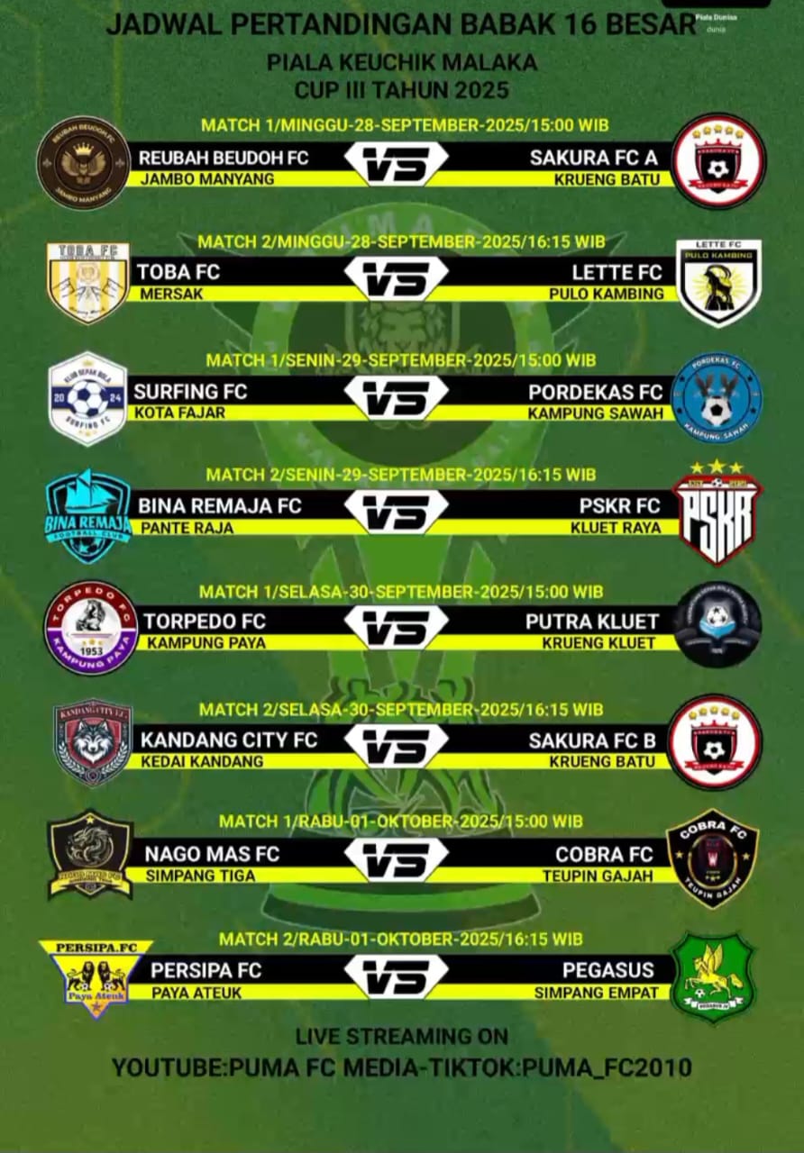 Sarannews akan terus mengikuti dan mengabarkan kepada Publik Jalannya ajang Turnamen ini hingga selesai, ini JADWAL PERTANDINGAN BABAK 16 BESAR PIALA KEUCHIK MALAKA CUP III TAHUN 2025: