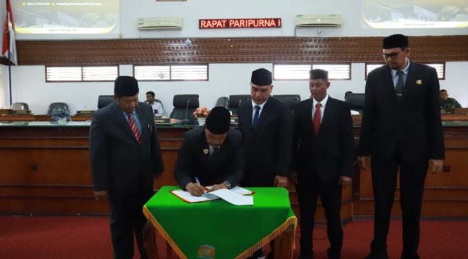 Penandatanganan Pakta integritas rekomendasi DPRK terhadap LKPJ Tahun Anggaran 2025 dalam rapat paripurna di Gedung DPRK Aceh Besar, Kota Jantho, Senin (27/4/2026).