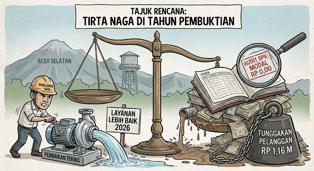 ACEH SELATAN (12 Januari 2026) – Tahun 2026 semestinya menjadi titik balik bagi Perusahaan Umum Daerah (Perumda) Tirta Naga. Setelah sekian lama berkutat dengan stigma “hidup segan mati tak mau”, perusahaan pelat merah milik Kabupaten Aceh Selatan ini mulai menunjukkan denyut nadi yang berbeda di bawah manajemen baru sejak pertengahan tahun lalu. Langkah Direktur Abdillah yang proaktif membenahi mesin pompa, membersihkan sedimen pipa, hingga menuntaskan perubahan status hukum perusahaan, patut kita apresiasi sebagai sinyal positif. Namun, euforia pembenahan teknis ini tidak boleh meninabobokan kita dari kenyataan pahit yang tertera di atas kertas neraca keuangan.