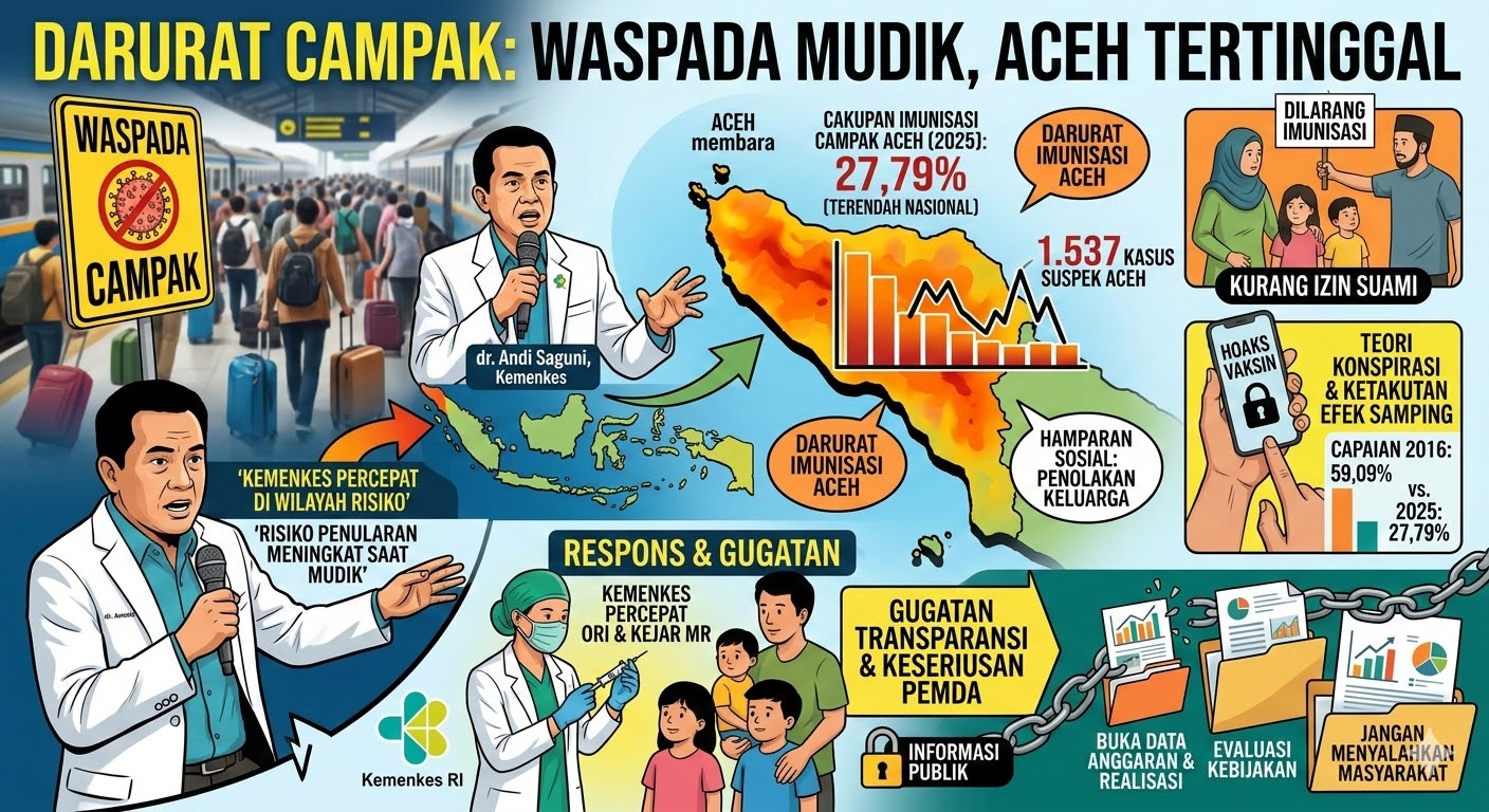 BANDA ACEH – Peringatan keras dari Kementerian Kesehatan Republik Indonesia terkait ancaman lonjakan kasus campak menjelang libur Lebaran tahun 2026 seharusnya menjadi tamparan keras bagi jajaran pemerintah daerah di Aceh. Menghadapi tingginya mobilitas masyarakat yang berpotensi memperluas penularan, wilayah ini justru terkurung dalam status krisis dengan cakupan imunisasi balita terendah di Indonesia, yakni hanya menyentuh angka 27,79 persen pada evaluasi tahun 2025. Angka yang merosot sangat drastis dari capaian satu dekade silam ini bukan sekadar deretan statistik di atas kertas, melainkan bukti nyata adanya kelemahan sistemik dalam melindungi hak kesehatan generasi penerus. Temuan ribuan kasus suspek campak yang menempatkan provinsi ini di jajaran tertinggi nasional menuntut lebih dari sekadar rutinitas imbauan normatif, melainkan sebuah evaluasi mendesak terhadap transparansi data dan keseriusan kebijakan kesehatan di tingkat birokrasi daerah.