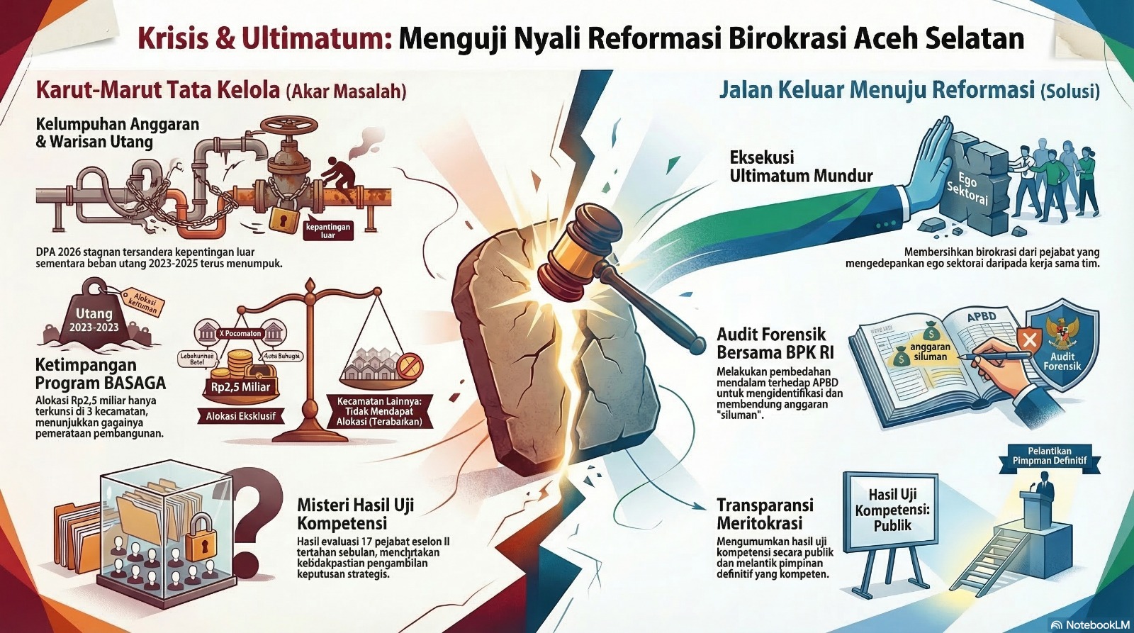 Kini, bola panas reformasi birokrasi sepenuhnya berada di genggaman H. Mirwan MS. Apabila bupati benar-benar memegang teguh komitmen meritokrasi demi menyelamatkan Aceh Selatan dari jurang kebangkrutan fiskal, langkah tunggal yang harus segera diambil adalah membuka hasil uji kompetensi tersebut ke hadapan publik dan berani mengganti para pejabat yang terbukti gagal bekerja sama, khususnya di pucuk pimpinan BPKD, dengan figur definitif yang bernyali besar. Sebaliknya, jika hasil evaluasi itu terus disembunyikan dan pejabat yang berkinerja buruk tetap dipertahankan, publik akan dengan mudah menyimpulkan bahwa ultimatum di lapangan apel hanyalah kedok untuk menutupi kompromi politik dan tawar-menawar di belakang layar. Seluruh elemen masyarakat, lembaga swadaya masyarakat, dan insan pers kini bersiap mengawasi secara ketat setiap tindak tanduk kebijakan bupati ke depan, karena keselamatan uang rakyat tidak boleh lagi dikorbankan demi merawat keharmonisan semu dengan segelintir elit penguasa.[red]