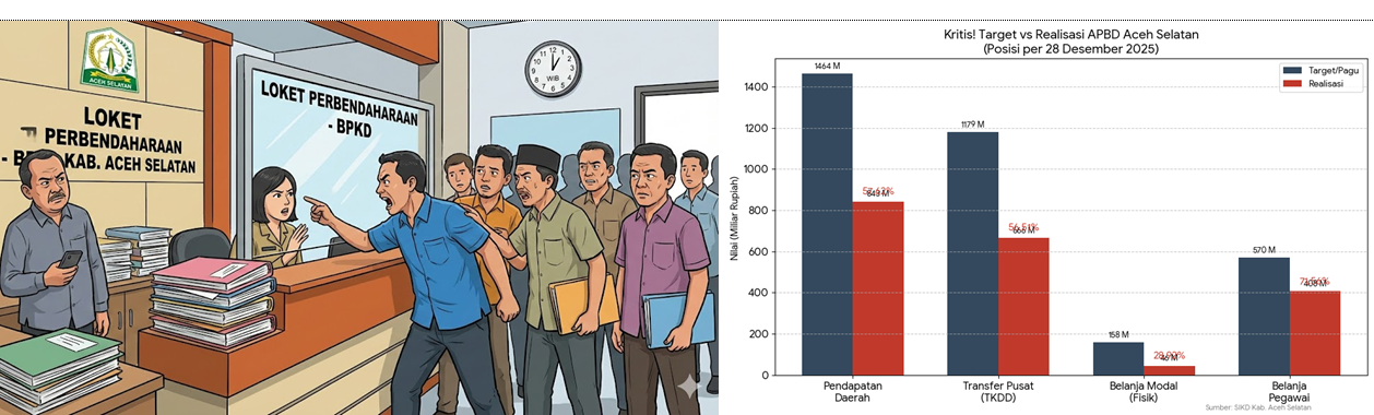Dengan ribuan dokumen pencairan yang masuk serentak hari ini, sementara kas daerah belum terisi penuh sesuai target, Pemerintah Kabupaten Aceh Selatan menghadapi tekanan likuiditas yang luar biasa berat. Publik kini menanti, apakah “lampu kuning” fiskal ini akan berakhir dengan pencairan dana (SP2D) yang mulus pada 31 Desember nanti, atau justru menjadi catatan utang panjang di awal tahun depan. (Tim Redaksi)
