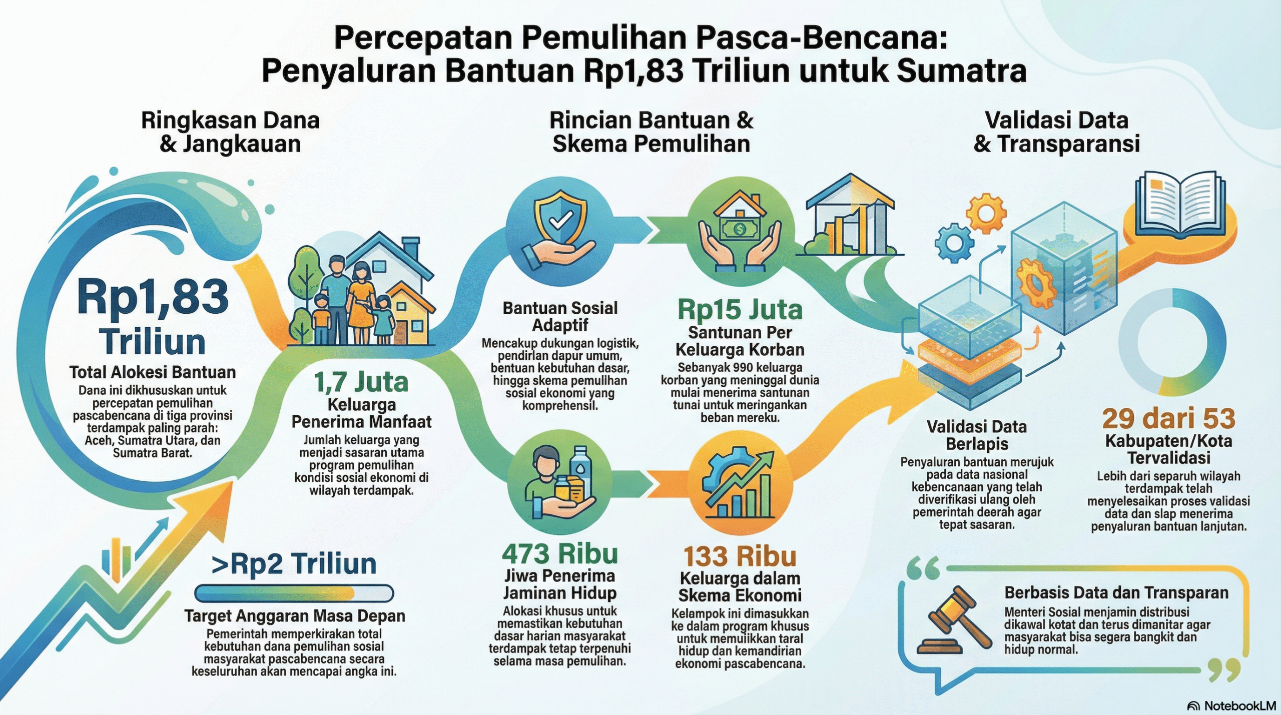 JAKARTA | SNN — Pemerintah pusat melalui Kementerian Sosial terus menggenjot percepatan penyaluran bantuan sosial bagi masyarakat yang menjadi korban bencana di wilayah Sumatra. Bantuan dengan total nilai mencapai sekitar Rp1,83 triliun ini dialokasikan khusus untuk tiga provinsi yang terdampak paling parah, yakni Aceh, Sumatra Utara, dan Sumatra Barat. Sebanyak 1,7 juta keluarga penerima manfaat menjadi sasaran utama dari program ini yang bertujuan untuk mempercepat pemulihan kondisi daerah pascabencana.