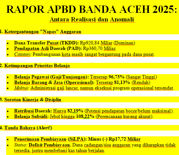 Tahun 2025 menyisakan pelajaran mahal. Pemerintah Kota Banda Aceh dan legislatif tidak bisa lagi berlindung di balik persentase penyerapan anggaran yang terlihat tinggi secara agregat. Kualitas belanja, kemandirian PAD, dan akurasi perencanaan pembiayaan adalah “pekerjaan rumah” raksasa yang harus dibereskan. Jangan sampai APBD kita hanya habis untuk membiayai birokrasi, sementara kemandirian fiskal jalan di tempat dan fondasi keuangan daerah justru keropos di dalam.[red]