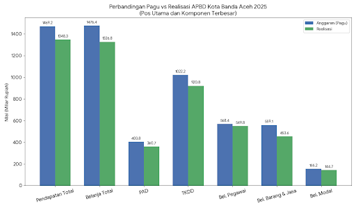BANDA ACEH | SaranNews – Lembaran tahun 2025 telah resmi ditutup. Data SIKD per 1 Januari 2026 yang diterima redaksi menyajikan potret akhir Postur APBD Kota Banda Aceh yang sepintas terlihat “aman”, namun menyimpan retakan serius jika ditelisik lebih dalam. Di atas kertas, realisasi pendapatan daerah mencapai 91,77 persen dan belanja terserap 89,87 persen. Sebuah capaian statistik yang mungkin cukup untuk membuat para pemangku kebijakan tersenyum lega. Namun, angka-angka tersebut sejatinya mengirimkan sinyal peringatan yang nyaring bagi tata kelola keuangan ibu kota provinsi ini.