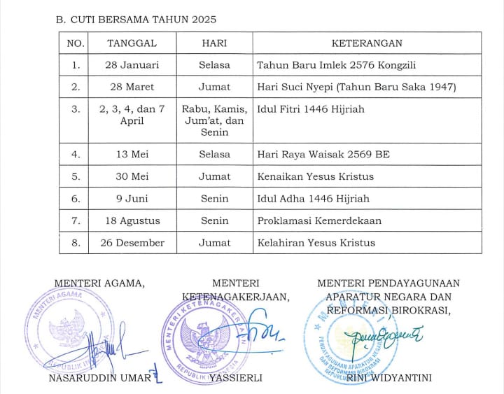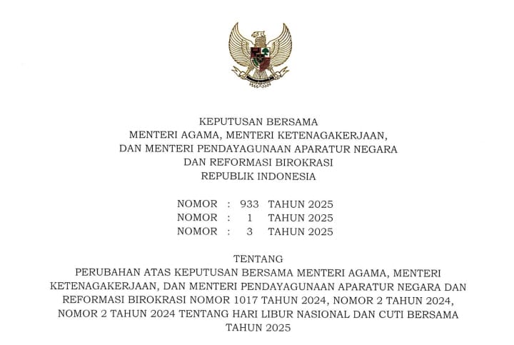 Keputusan ini merupakan perubahan atas SKB sebelumnya mengenai hari libur nasional dan cuti bersama tahun 2025. Dengan adanya penetapan baru ini, daftar cuti bersama untuk tahun 2025 secara resmi bertambah satu hari. SKB ini ditandatangani oleh Menteri Agama Nasaruddin Umar, Menteri Ketenagakerjaan Yassierli, serta Menteri Pendayagunaan Aparatur Negara dan Reformasi Birokrasi Rini Widyantini.(Red)