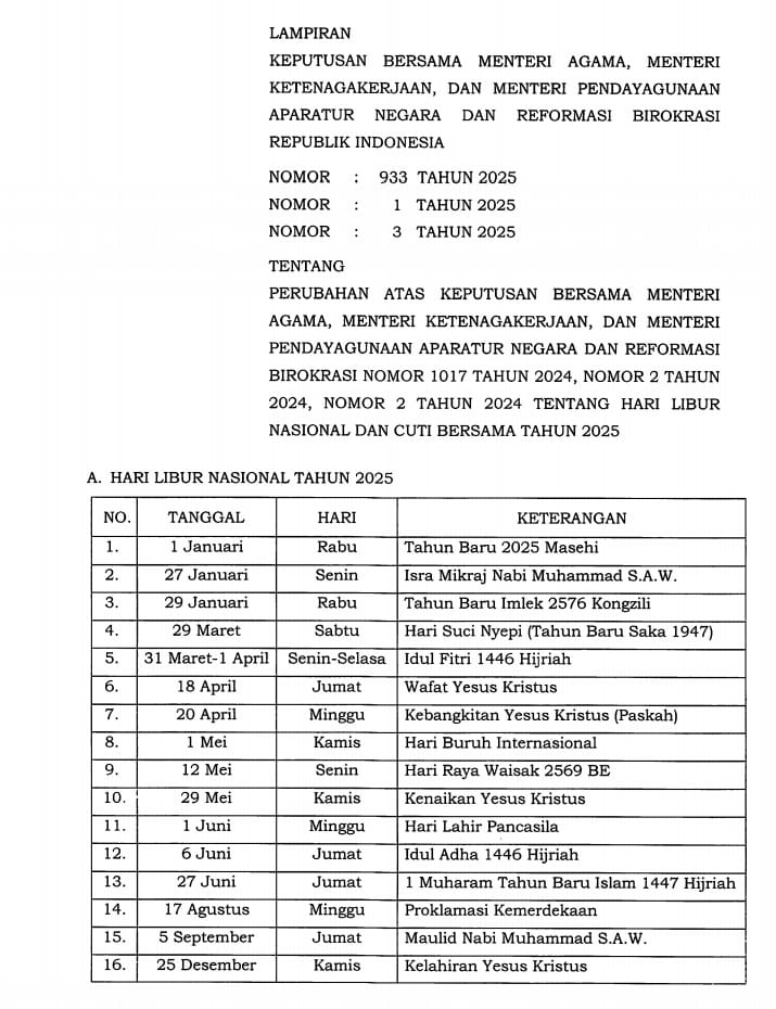 Berikut adalah daftar lengkap hari libur nasional dan cuti bersama tahun 2025 berdasarkan lampiran SKB terbaru: