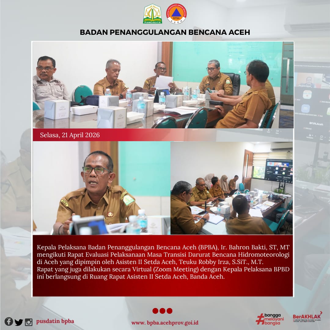 Rapat ini bertujuan untuk meninjau sejauh mana efektivitas penanganan dan koordinasi antarinstansi selama masa transisi darurat bencana hidrometeorologi, seperti banjir dan tanah longsor, yang sempat melanda beberapa wilayah di Aceh.