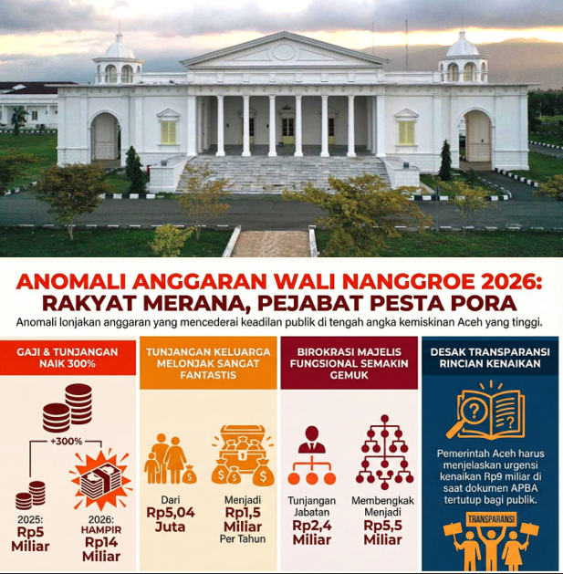 Banda Aceh | SNN – Di tengah kondisi ekonomi Aceh yang diprediksi melambat dan angka kemiskinan yang masih menjadi “juara” di Sumatera, sebuah kabar mengejutkan jika tidak bisa disebut menyakitkan datang dari dokumen evaluasi APBA 2026. Ada lonjakan angka yang tak masuk akal, fantastis, dan melukai rasa keadilan publik dalam pos belanja gaji dan tunjangan Lembaga Wali Nanggroe.