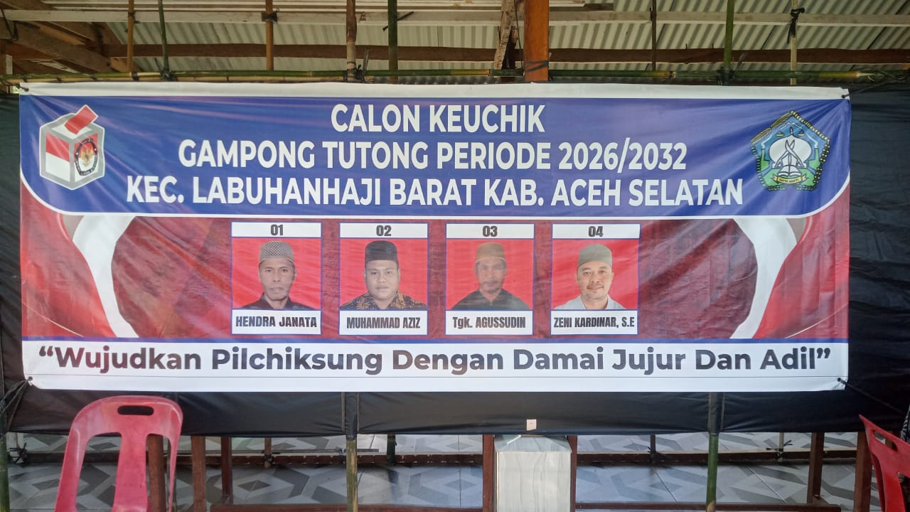 Sementara itu, persaingan di Gampong Tutong juga tidak kalah sengit. Berdasarkan data spanduk resmi pemilihan, desa ini menghadirkan empat calon kandidat. Para calon tersebut adalah nomor urut 01 Hendra Janata, nomor urut 02 Muhammad Aziz, nomor urut 03 Tgk. Agussudin, dan nomor urut 04 Zeni Kardinar, S.E. Gampong Tutong tercatat memiliki jumlah Daftar Pemilih Tetap (DPT) terbesar dalam pemilihan kali ini, yakni mencapai 1.167 pemilih (576 laki-laki dan 591 perempuan). Panitia pemilihan setempat menekankan komitmen mereka melalui slogan “Wujudkan Pilchiksung Dengan Damai Jujur Dan Adil”.