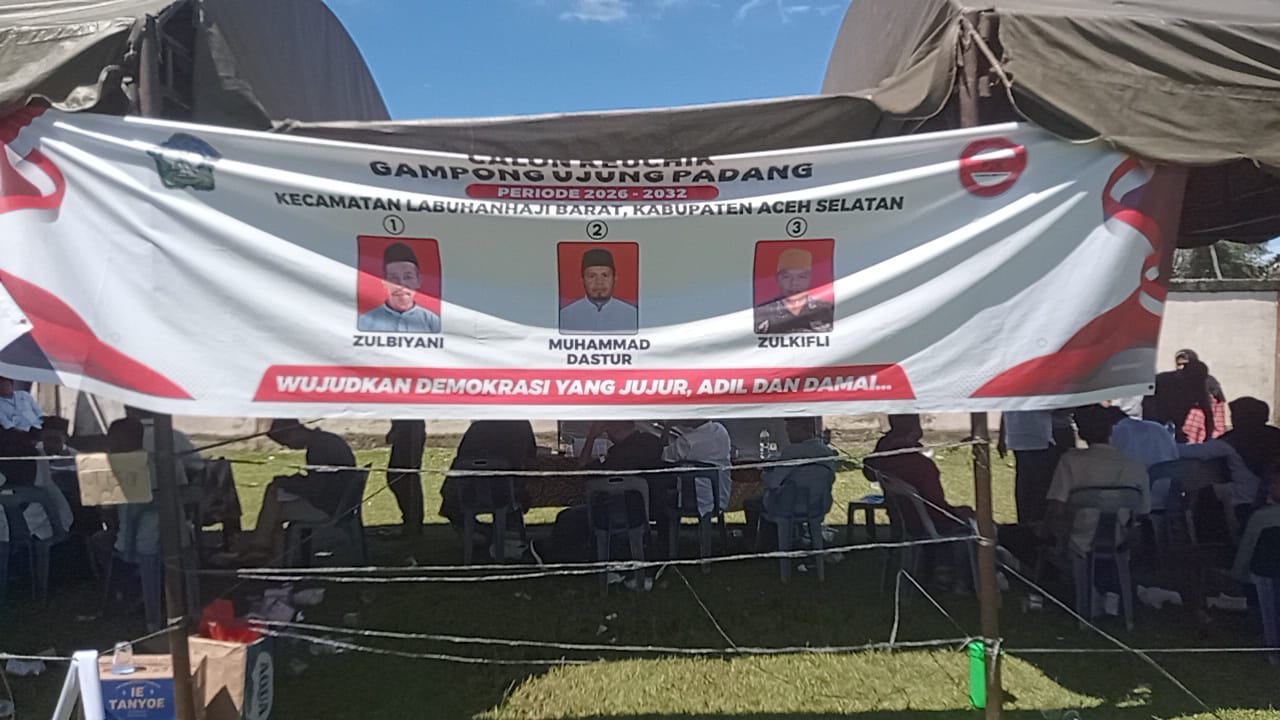 Di Gampong Ujung Padang, antusiasme warga terlihat jelas di lokasi pemungutan suara (TPS) yang didirikan di lapangan terbuka. Sebuah spanduk besar menampilkan tiga kandidat yang berkompetisi memperebutkan kursi pimpinan desa, yaitu nomor urut 1 Zulbiyani, nomor urut 2 Muhammad Dastur, dan nomor urut 3 Zulkifli. Dengan mengusung semangat “Wujudkan Demokrasi yang Jujur, Adil, dan Damai”, proses pemungutan suara di dua TPS yang tersedia berjalan lancar dengan pengawasan ketat panitia.
