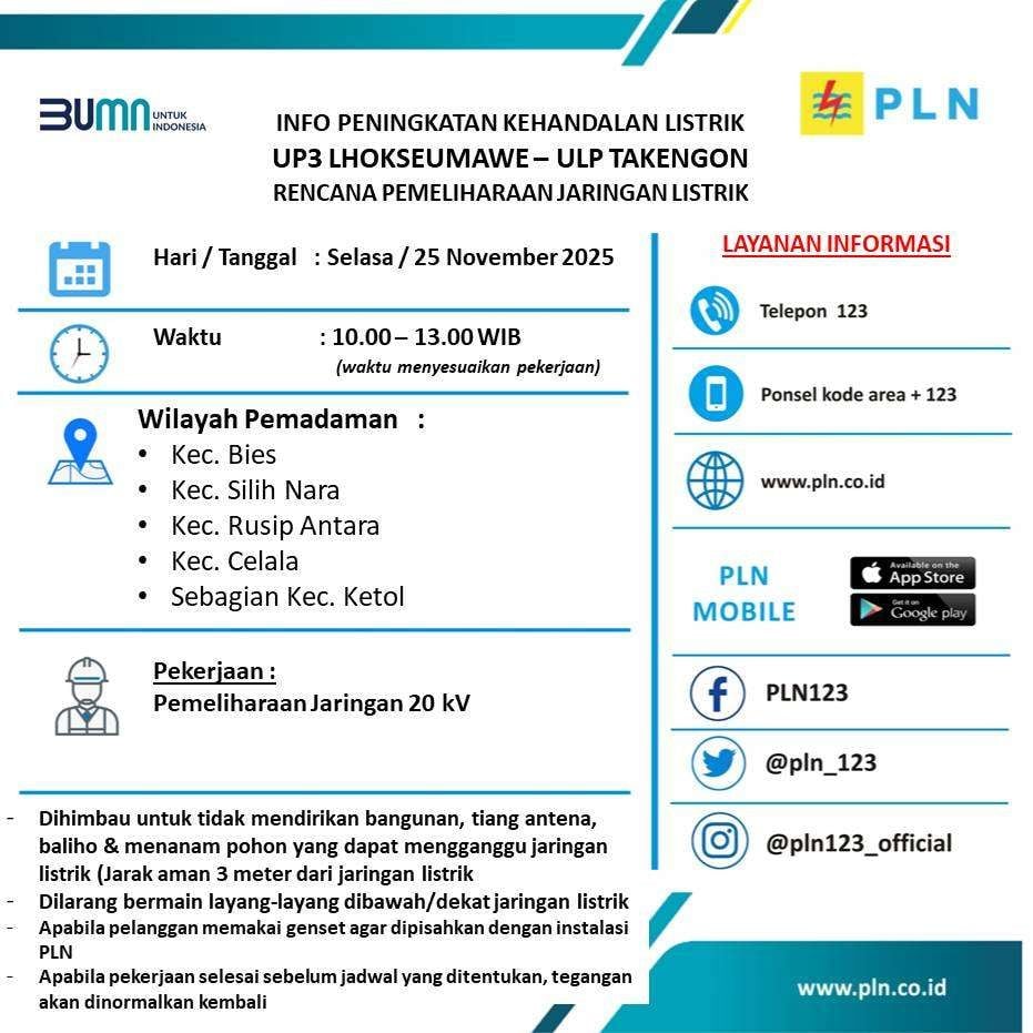 TAKENGON | SaranNews – PLN Unit Layanan Pelanggan (ULP) Takengon di bawah koordinasi UP3 Lhokseumawe menjadwalkan pemeliharaan jaringan listrik pada Selasa, 25 November 2025. Agenda ini dilakukan sebagai upaya meningkatkan keandalan pasokan listrik di wilayah kerja PLN Takengon.