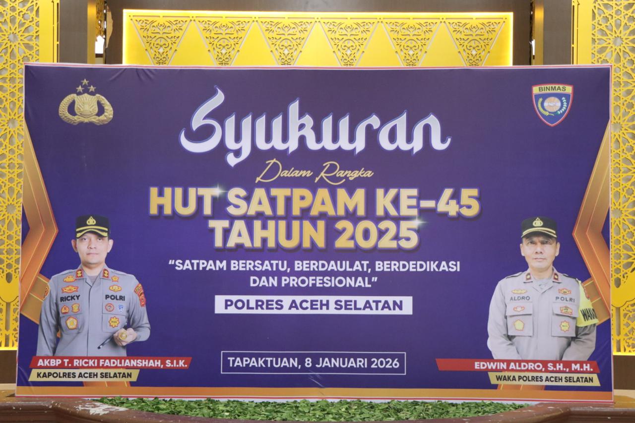 TAPAKTUAN | SaranNews – Kepolisian Resor (Polres) Aceh Selatan menggelar syukuran Hari Ulang Tahun (HUT) Satuan Pengamanan (Satpam) ke-45 Tahun 2026 di Aula Bhara Daksa Polres Aceh Selatan. Kegiatan ini menjadi ajang memperkuat sinergi antara kepolisian dan pengamanan swakarsa.