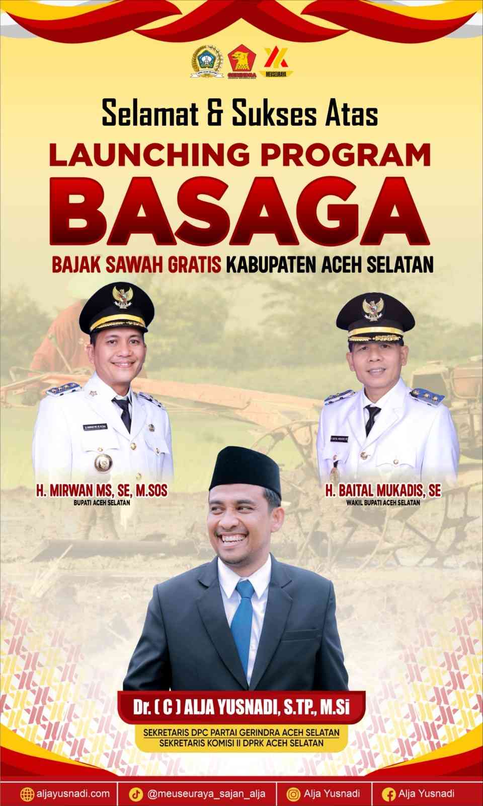 Aceh Selatan|SaranNews.Net – Pemerintah Kabupaten Aceh Selatan akan melakukan launching program Bajak Sawah Gratis (BASAGA) yang akan dilaksanakan pada Selasa 13 Mei 2025 bertempat di Gampong Tengah Peulumat Kecamatan Labuhan Haji Timur.