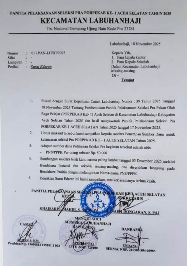 Aceh Selatan | SaranNews – Publik Aceh Selatan, khususnya para Aparatur Sipil Negara (ASN) dan tenaga PPPK di tingkat kecamatan, dikejutkan oleh beredarnya surat edaran terkait pelaksanaan seleksi Pra Pekan Olahraga Pelajar Kabupaten (PORPEKAB) Ke-1 Tahun 2025. Salah satu contoh nyata terjadi di Kecamatan Labuhanhaji, di mana melalui Surat Edaran Panitia Nomor 01/PAN-LH/XI/2025, ditetapkan adanya kewajiban pengumpulan dana sebesar Rp50.000 per orang bagi setiap PNS dan PPPK.