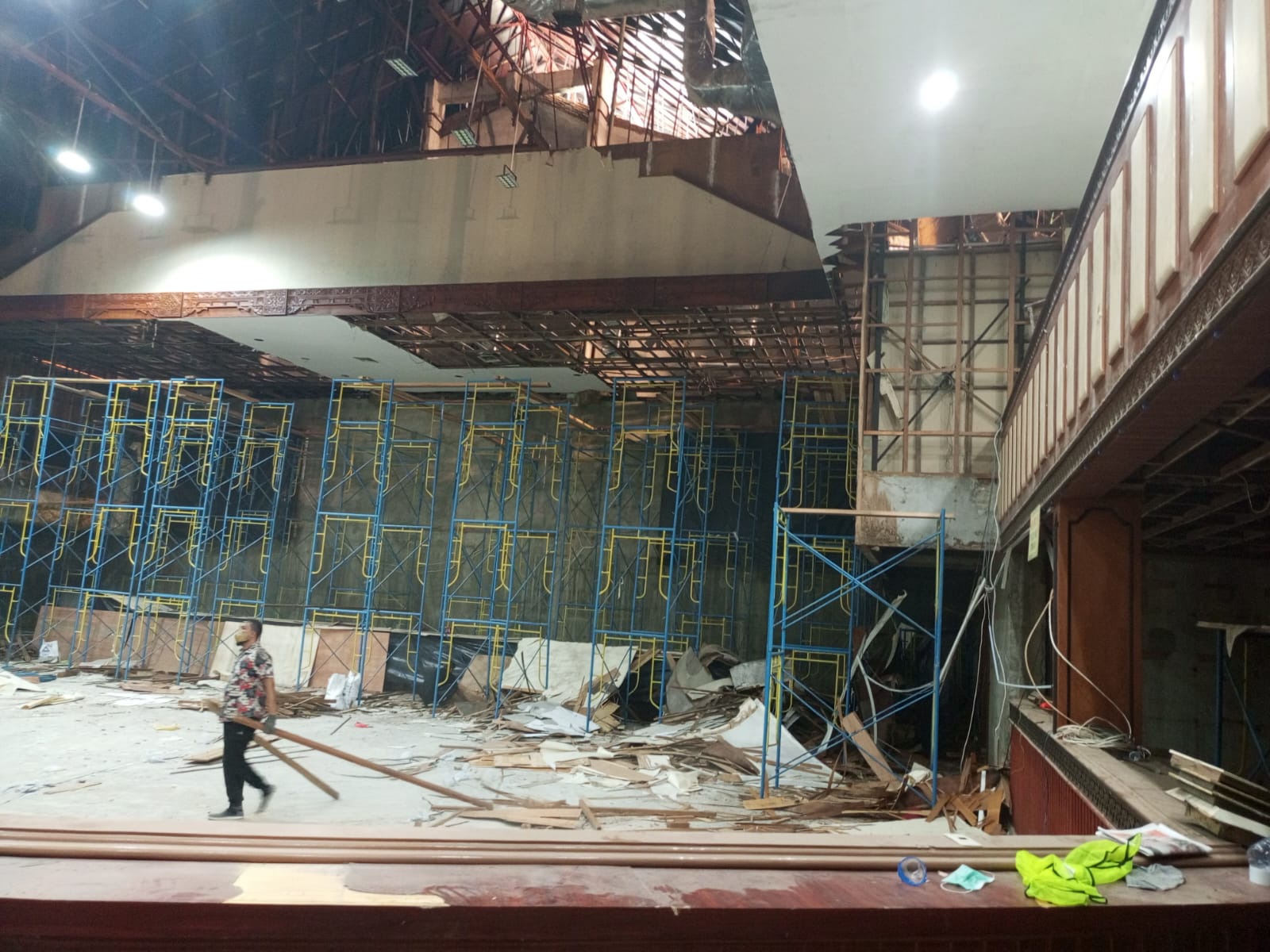 Di halaman gedung, terlihat tumpukan material bongkaran berupa kayu dan plafon yang dibiarkan menumpuk. Sementara di ruang utama, pekerjaan pembongkaran plafon dan pemasangan perancah sedang berlangsung. Namun, dari hasil pantauan visual, tampak pekerja berada di area proyek tanpa menggunakan Alat Pelindung Diri (APD) standar, seperti helm proyek, sepatu keselamatan, maupun rompi kerja. Kondisi ini tidak hanya melanggar prinsip dasar Keselamatan dan Kesehatan Kerja (K3), tetapi juga berpotensi melanggar UU No. 1 Tahun 1970 tentang Keselamatan Kerja serta Permenaker No. 5 Tahun 2018 tentang K3 Lingkungan Kerja.