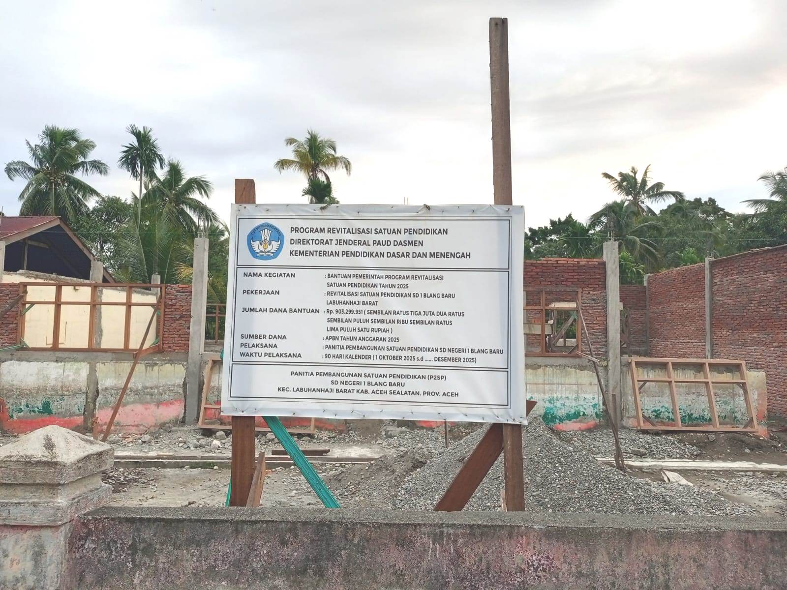 ACEH SELATAN | SaranNews – Pelaksanaan Program Revitalisasi Satuan Pendidikan di SDN 1 Blang Baru, Kecamatan Labuhanhaji Barat, diduga berjalan tanpa pengawasan yang memadai. Proyek yang bersumber dari Anggaran Pendapatan dan Belanja Negara (APBN) ini juga diwarnai dengan pengabaian standar Keselamatan dan Kesehatan Kerja (K3) oleh para pekerjanya.